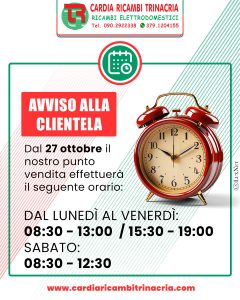 | Venerdì: | 08:30 – 13:00, 15:30 – 19:00 |